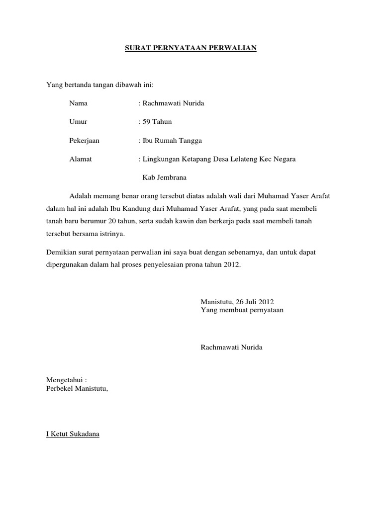 Fotokopi Surat Pernyataan Perwalian - Kumpulan Surat Pernyataan Kerja Kesanggupan Belum Menikah Ahli Waris Dll. Berikut ini akan kami tampilkan contoh surat pernyataan tauliyah bil kitabah ( mewakilkan hak perwalian secara tertulis) , yang digunakan untuk mewakilkan hak perwalian secara tertulis kepada pihak kua. Biasanya surat ini dilengkapi dengan materai sebagai penguat kepercayaan dan agar terlihat kredibel. Banyak orang yang masih asing dengan klausa yang satu ini. Apabila surat pernyataan ini tidak benar, saya bersedia dikenakan sangsi sesuai peraturan yang berlaku. Surat pernyataan persetujuan menempati dan memiliki dokumen kependudukan dengan alamat rumah/tempat tinggal (kontrakan/kos/asrama) dari pemilik dengan melampirkan fotokopi ktpel.